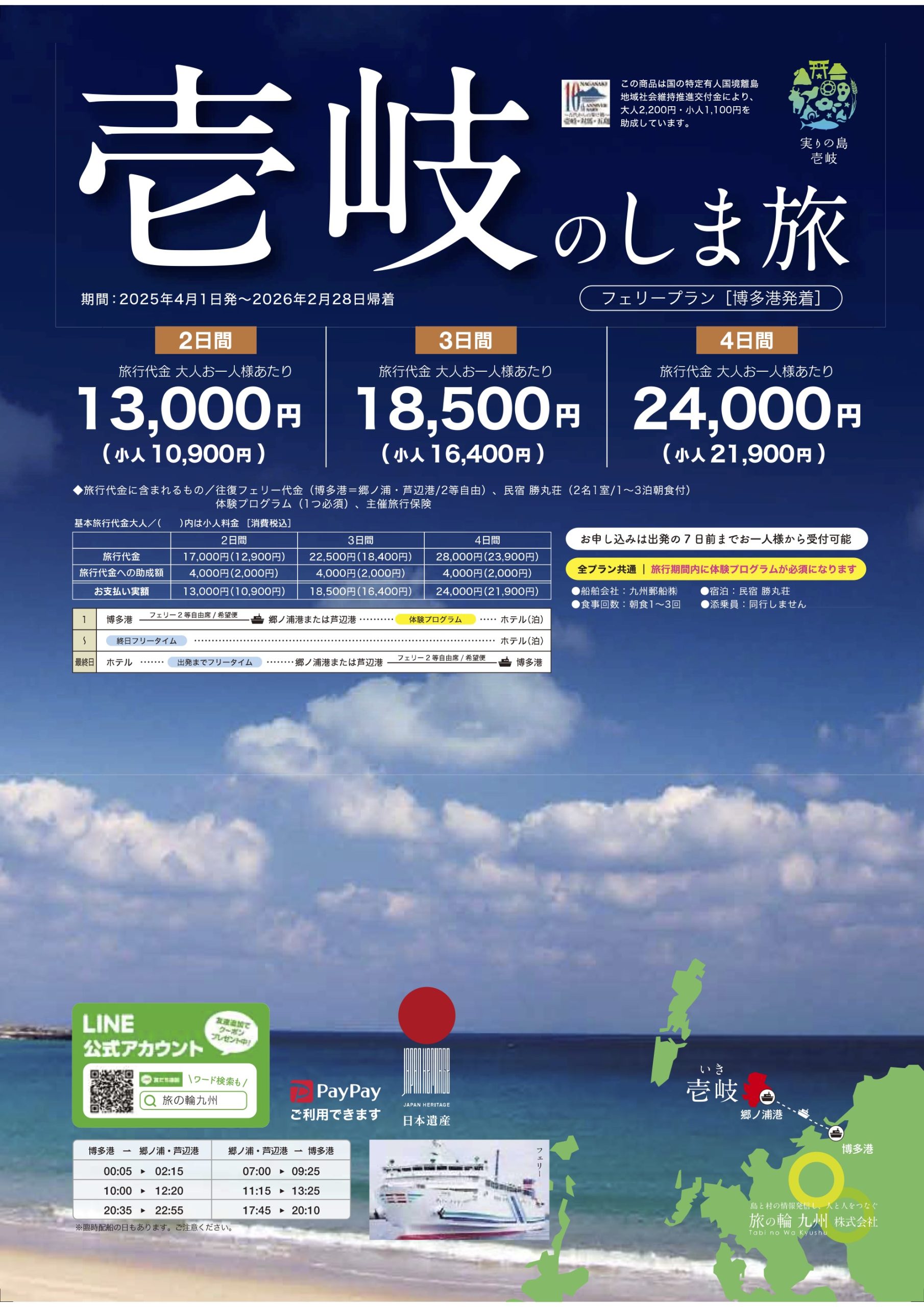 【博多港発着】フェリーで行く!壱岐の島旅 2〜4日間 <助成金終了>2025/4/1〜2026/2/28 2025.10.25掲載壱岐島 島旅壱岐申し込みフォーム 壱岐申し込みフォーム ツアー一覧へ戻る