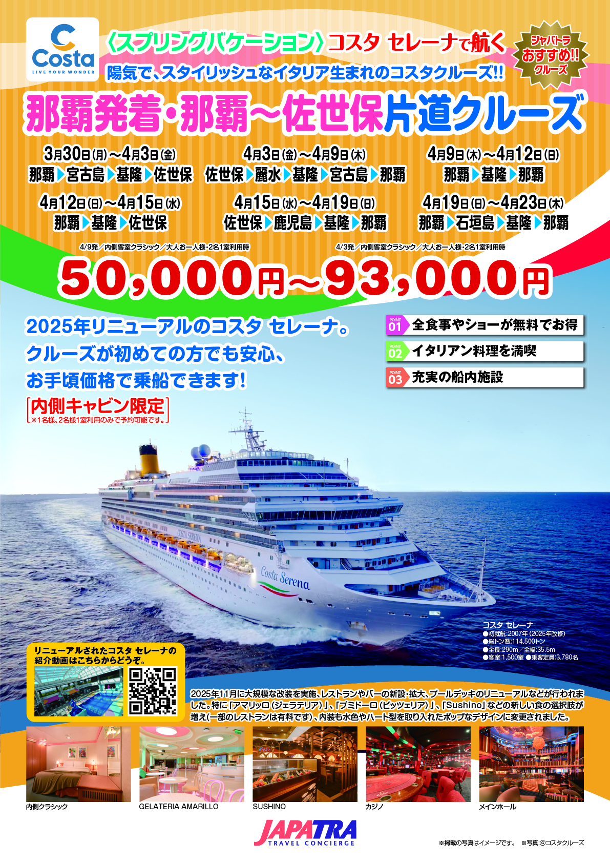 【那覇発着】コスタセレーナで行く!那覇~佐世保片道クルーズ 50,000円~93,000円